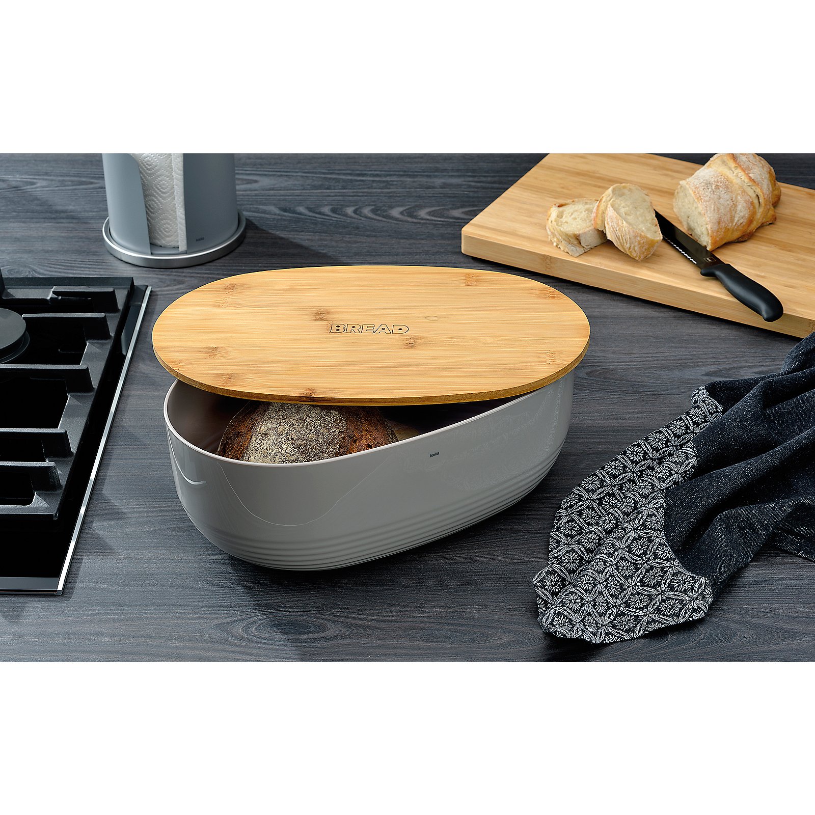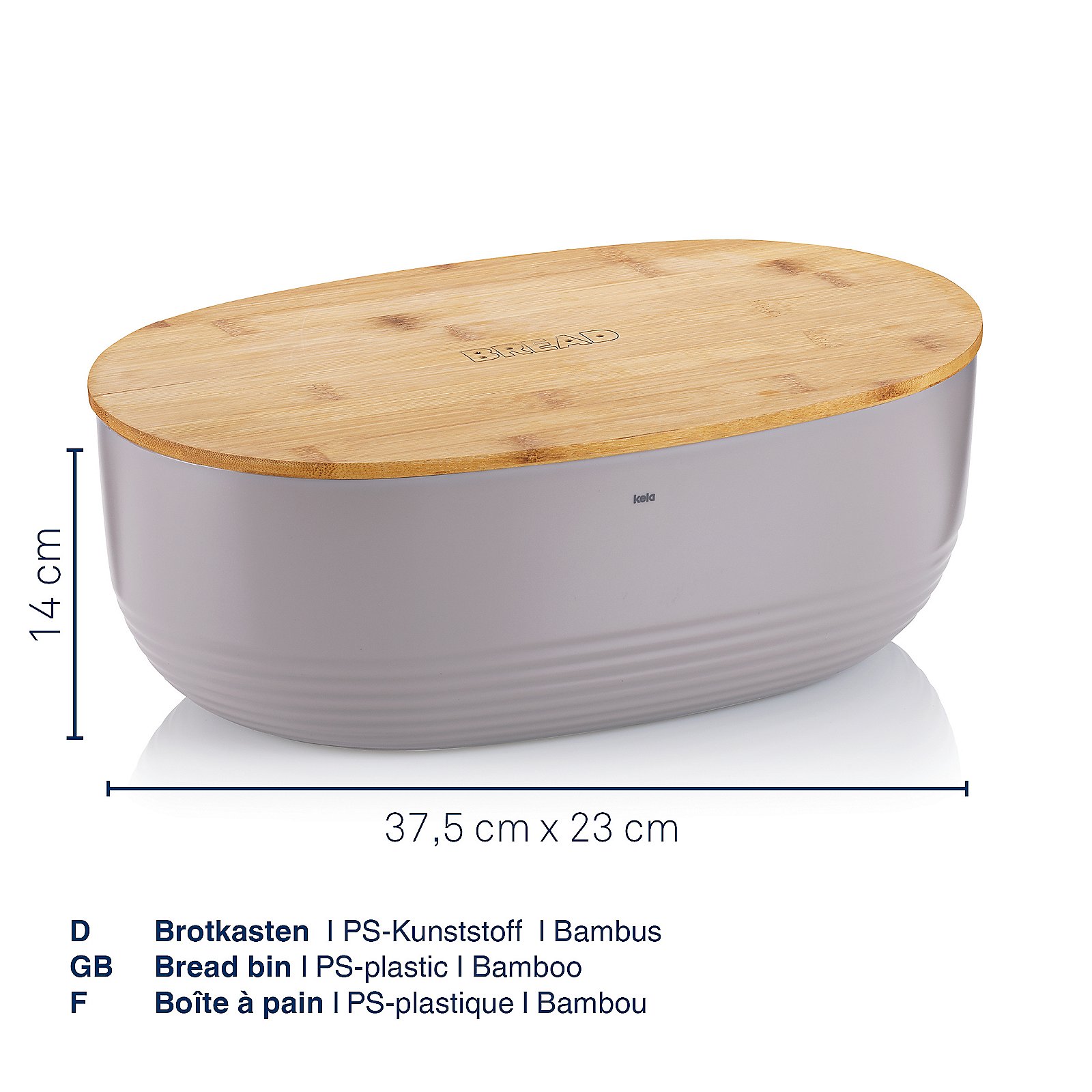 Het Namur broodblik van Kela valt op tussen klassieke broodtrommels — een stijlvol keukenaccessoire. Ronde, stevige kunststof container met afneembaar bamboedeksel voor snelle toegang. Ruimtebesparend: 37,5 × 23 × 14 cm. Kleur: elegant opaalgrijs.