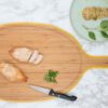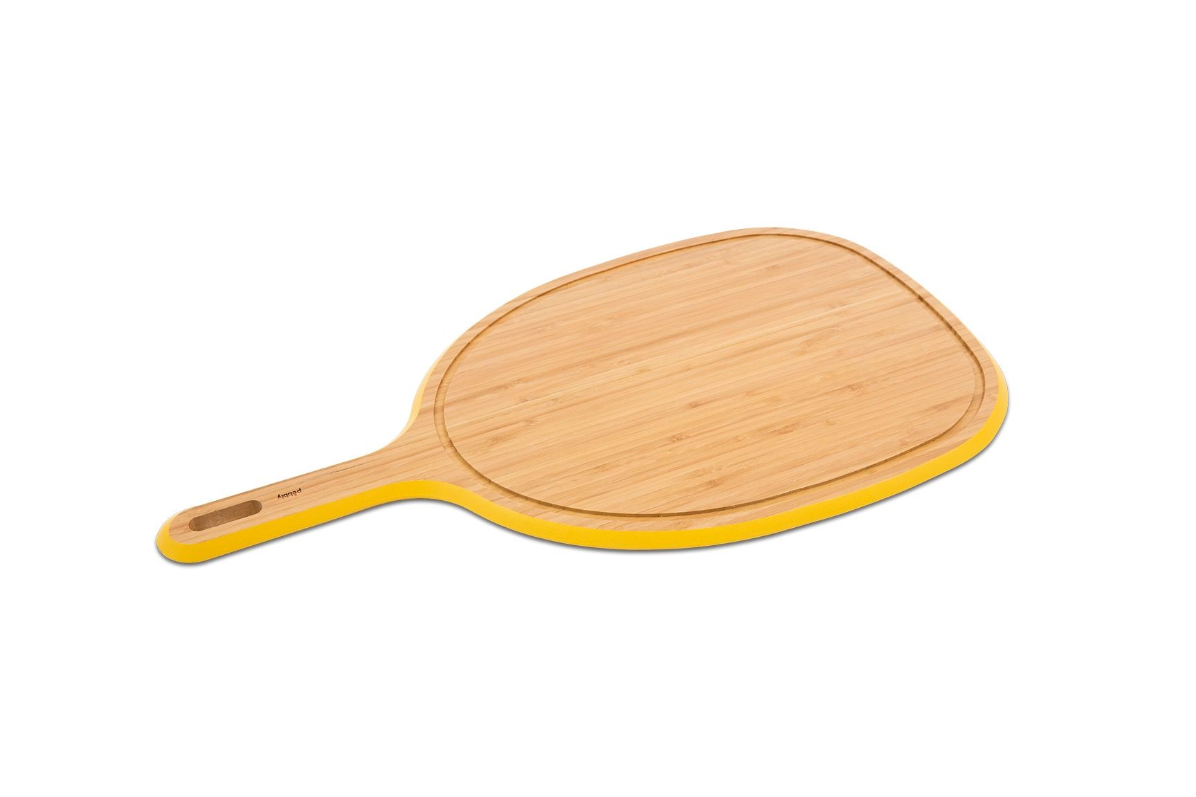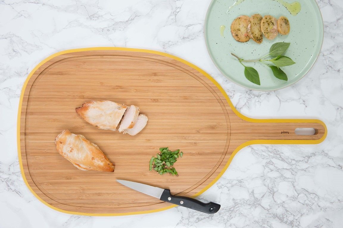 Pebbly bamboe snijplank L met handvat — lichtgewicht, 100% natuurlijk en duurzaam. Dubbelzijdig: glad en met sapgleuf voor kruimels en sappen. Multifunctioneel als snij- of serveerplank, BPA-vrij, antibacterieel en vochtbestendig. Stijlvol geel randje. Niet vaatwasserbestendig. Ecologisch ontworpen door het Franse merk Pebbly.